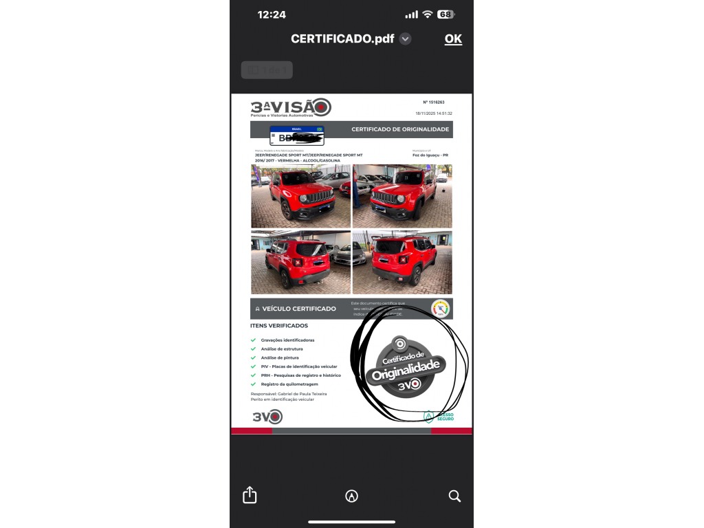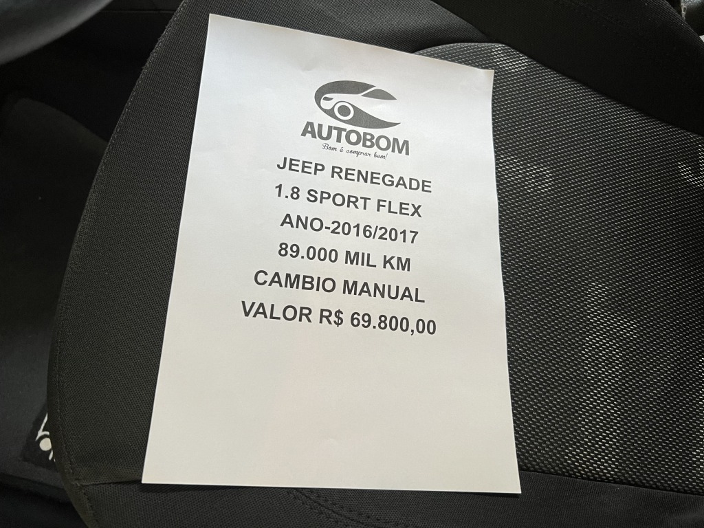 Jeep Renegade modelo Sport 1.8 Flex com sistema de corrente de comando, câmbio manual de 5 marchas, Freios Abs, Airbags Frontais, Controle de estabilidade, ISOFOX PARA CADEIRA INFANTIL, Assistente de partida em rampa, Travamento central das portas, Monitoramento de pressão dos pneus, sensores de estacionamento traseiro, Ar-condicionado, Banco do motorista com ajuste de altura, limitador de velocidade, Direção assistida, som, computador de bordo, rodas esportivas. CERTIFICADO DE ORIGINALIDADE PELA TERCEIRA VISÃO.